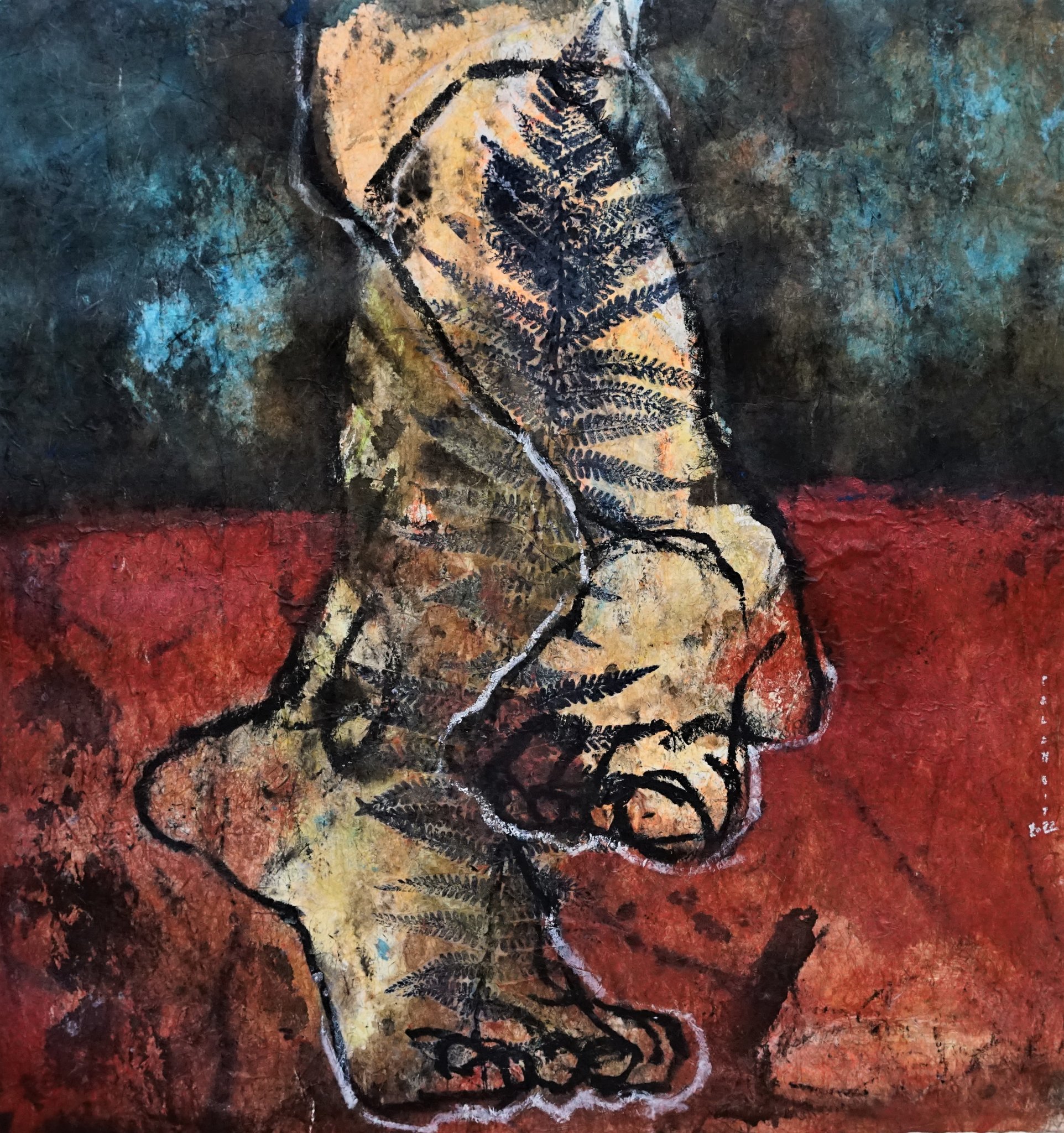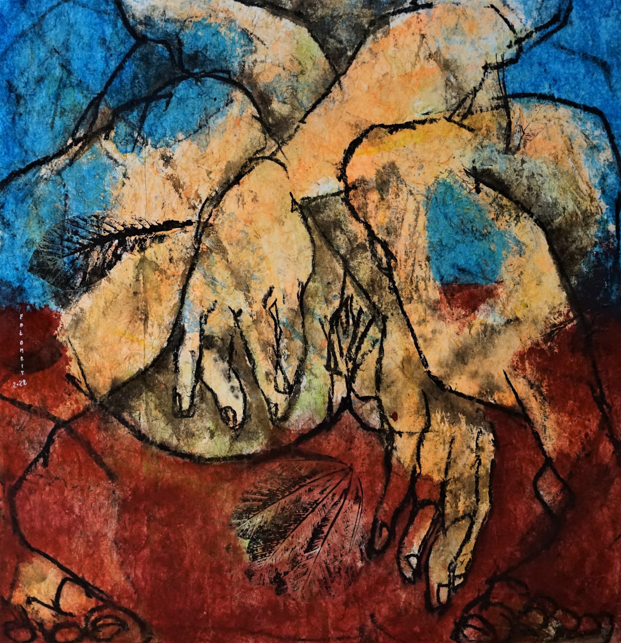 Artiste de l'instinct, Marie-Christine Palombit explore le territoire vertigineux du féminin. Inspiré d'expériences initiatiques, de lectures analytiques et de gestes sauvages, son voyage pictural donne à voir des corps nus, mis en mouvement dans des postures archaïques.